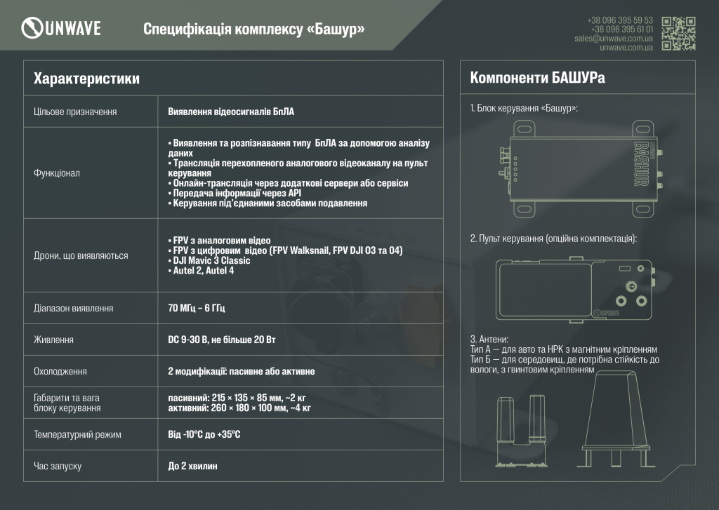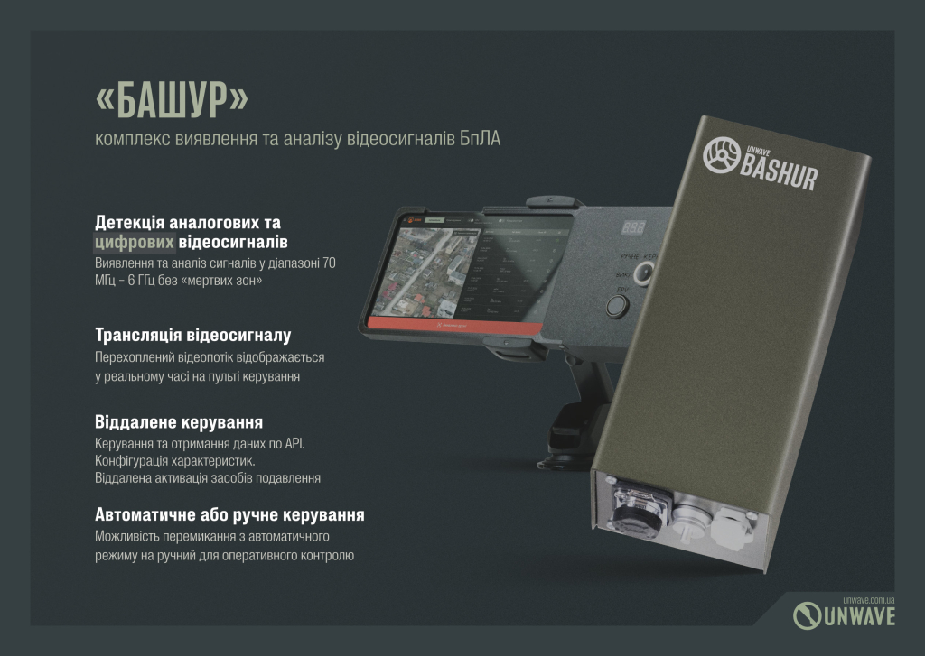 «Башур» — це нове рішення від української компанії Unwave, створене для автоматизації захисту від дронів. Комплекс виявлення та аналізу цифрових і аналогових відеосигналів БпЛА: